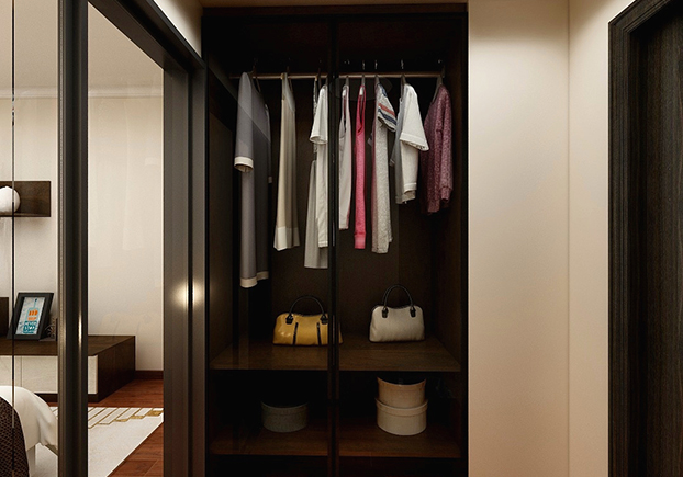 主臥旁邊做了一個入墻衣柜,將異形空間利用起來,可以放一些平常利用率高的衣物和包包,上班急著出門直接從這兒拿,方便又快捷。