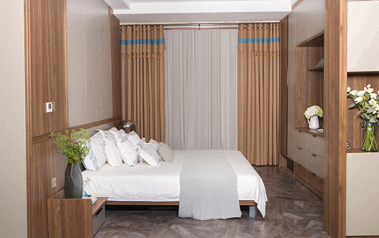 卡諾亞丨都市閑情·臥房開啟繁忙的都市生活,從睡一個好覺開始!大面積的護墻系統使用,冬暖夏涼、吸音減噪、防潮吸濕。運用時尚豎紋線條,護墻系統與墻等寬色塊設計,讓人備受呵護,更具安全感。深色木紋與淺灰搭配使用,寧靜的色調中賦予臥房別樣的靜謐。